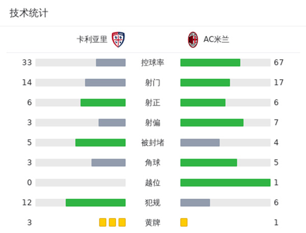 第40分钟,普利西奇左路突破横传中路,门将扑球不远,奥卡福补射破门,AC米兰1-1卡利亚里。
