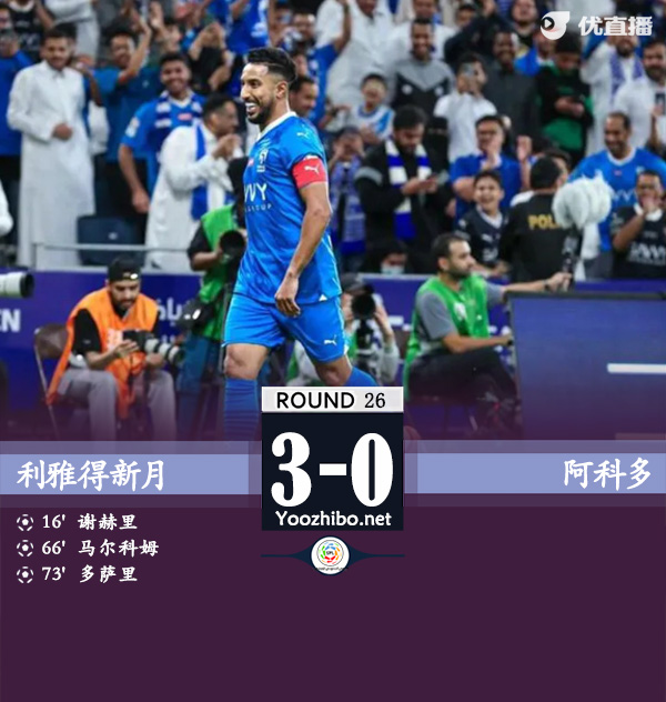 24直播网讯:北京时间4月3日03:00,沙特联赛第26轮利雅得新月迎战阿科多的比赛,上半场内维斯助攻谢赫里头球破门,科利亚多失单刀,下半场达瓦萨里助攻马尔科姆单刀破门,内维斯助攻多萨里推射扩大比分,最终利雅得新月3-0阿科多豪取31连胜12分领跑。