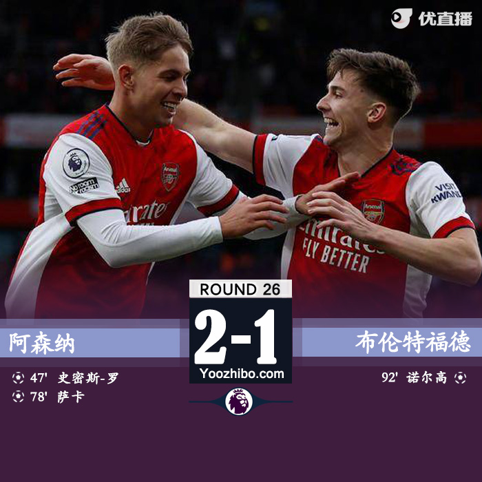 24直播网2月19日讯 北京时间2月19日23:00,英超联赛第26轮阿森纳主场迎战布伦特福德的比赛,上半场拉卡泽特进球被吹越位。半场阿森纳0-0布伦特福德。下半场史密斯罗闪击破门,萨卡爆射建功,补时阶段诺尔高扳回一城,最终阿森纳2-1布伦特福德。