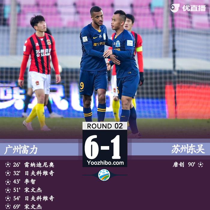 第64分钟,伍承儒右路带球突破被李智铲倒,李智吃到了一张黄牌。第68分钟,宋文杰前场中路拿球,加速突破胡鸣飞后突入禁区,右脚的轻松推射打进远角,广州富力6-0苏州东吴。第82分钟,卢琳左路套边接球后直接传中,伍承儒后点插上拼抢碰出底线。随后辛巴耶夫右路内切到弧顶,左脚的劲射被封堵。第89分钟,黄政宇中圈得球加速突到禁区线上,面对出击的门将选择一脚吊射,皮球稍稍偏出左侧。第91分钟,辛巴耶夫右路突破到禁区内横传被阻挡,禁区右侧唐创得球突破防守,右脚打远角得分,广州富力6-1苏州东吴。最终全场比赛结束,广州富力6-1苏州东吴。