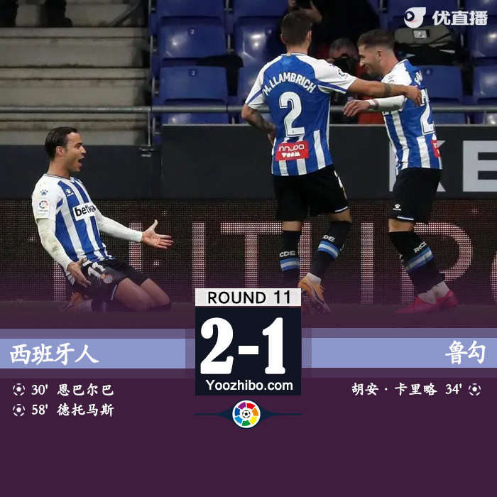 全场比赛结束,西班牙人2-1卢戈。