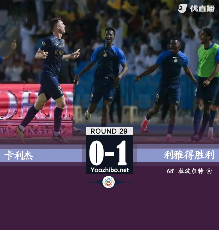 24直播网讯:北京时间4月28日2:00,沙特联第29轮,利雅得胜利客场对阵卡利杰。上半场,C罗击中横梁,随后进球越位被吹。下半场,拉波尔特任意球机会头球破门!最终,利雅得胜利1-0击败卡利杰,取得联赛6连胜!先赛距离排名榜首的利雅得新月9分,仍居第2。