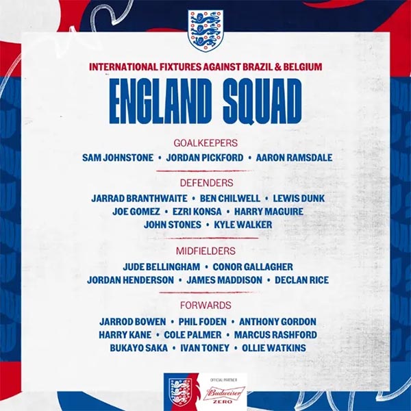 24直播网讯 北京时间3月15日,英格兰主教练索斯盖特公布了欧洲杯前最后两场国际友谊赛的25人大名单。