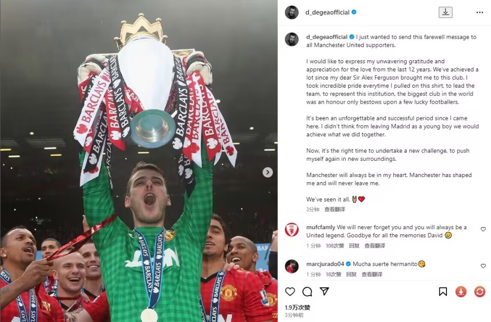 德赫亚在长文中,感谢了弗格森爵士将他带到曼联,自己无比自豪能在曼联效力12年之久。随后他深情告别道:“现在,是时候接受新的挑战,在新的环境中再次超越自我了,曼联将永远留在我的心中,曼彻斯特塑造了我,永远不会离开我。”