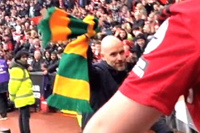 24直播网05月01日讯 曼联主场1-0战胜维拉后,人们看到主帅滕哈格拾起了地上的一条绿金色的围巾,曼联球迷不禁激动起来。红魔拥趸佩戴绿色和金色相间的围巾,是反抗格雷泽家族的标志。这是对俱乐部前身牛顿希斯的怀念,曼联建队后前24年的历史中,一直穿着绿色和金色对开的球衣。