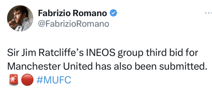 众所周知,曼联的拥有者格雷泽家族一直都在尝试出售俱乐部。而谢赫-贾西姆领导的卡塔尔财团、英国首富拉特克利夫所有的英力士集团,是主要的两大竞购者。