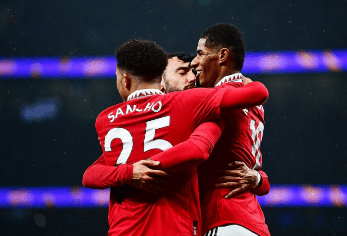 比赛第7分钟,拉什福德在前场完成了精彩的突破过人,随后斜传空位的桑乔,后者杀入禁区内切突然冷射兜远角得手,曼联1-0热刺;比赛第44分钟,B费在快攻过程中一脚长传,精准找到了前插的拉什福德,后者单挑后卫杀入禁区小角度爆射破门,曼联2-0领先。
