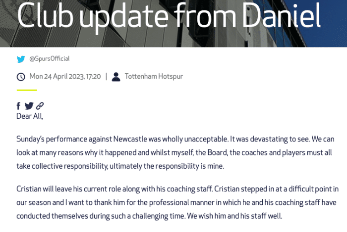 最终,热刺主席列维做出了1个月内第2次换帅的决定。列维在官方声明直言,1-6的惨败无法接受。董事会、教练和球员都必须承担集体责任,但最终责任在自己。