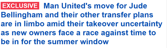 英国《每日邮报》称,消息人士透露,曼联的夏窗引援计划,不仅是贝林厄姆,还有其他目标,也都因收购是否会及时完成的不确定性,而不同程度受阻。曼城认为自己处于有利地位,他们与多特蒙德就贝林厄姆的转会进行了初步对话;皇马也被曝愿不惜代价争夺贝林厄姆,而曼联从起步就已落后于人。