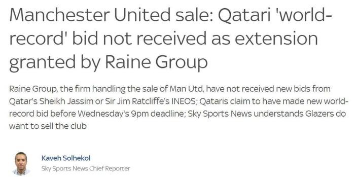 英国天空体育报道称,谢赫贾西姆和吉姆·拉特克里夫两个热门的潜在买家,都要求延期报价,这也得到了雷恩集团的认可,但是延期持续多长时间还不得而知。曼联老板格雷泽家族仍然没有表明他们想要多少钱,传闻是60亿英镑,但甚至最高层人士也不知道具体要价。不过,天空体育被告知,格雷泽确实想卖掉俱乐部。据了解,周三晚上21点之前,有8份报价发给了雷恩,但并不是所有的出价都是直接购买曼联。其中,只有美国对冲基金埃利奥特公开表示自己提出了方案。而谢赫贾西姆的财团声称,他们在周三的截止日期前提交了一份提升出价、并确保曼联无债务的收购方案,但之后事态发生了戏剧性的发展。雷恩集团坚称没有收到这份报价,并透露卡塔尔财团要求延长限期。