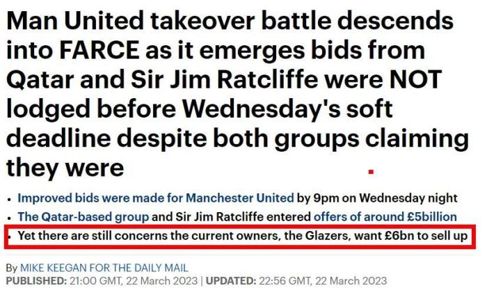 周三较早时候,英媒宣称谢赫贾西姆和拉特克里夫都会报价50亿英镑左右,足以创造世界体坛新纪录。任何超过37.5亿英镑的出价,都将打破去年夏天NFL球队丹佛野马被出售时创下的体育俱乐部价格世界纪录。目前,NFL的华盛顿指挥官也将被出售,预计售价也将超过这个数字,美媒认为会在60亿美元(48.9亿英镑)成交。英国《每日邮报》称,外界仍然担心格雷泽家族如果无法得到60亿英镑以上的理想价格,会拒绝出售曼联。该报形容,曼联收购之战已经变成了一场闹剧(Farce)。