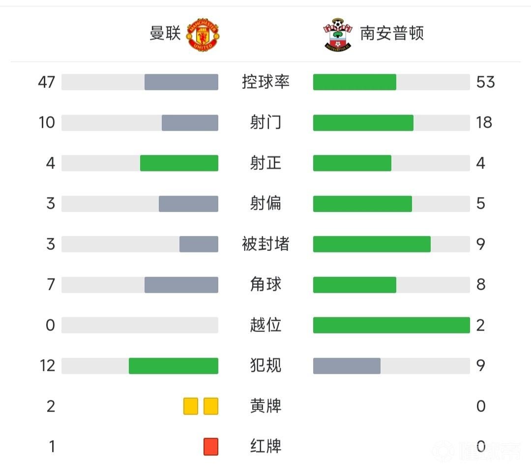 最终全场比赛结束,十人曼联0-0战平南安普顿。