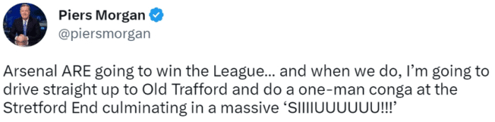 24直播网讯03月06日近日,知名主持人皮尔斯-摩根在个人社交媒体上表示,当阿森纳夺得英超冠军时,他会去老特拉福德的死忠看台siu。