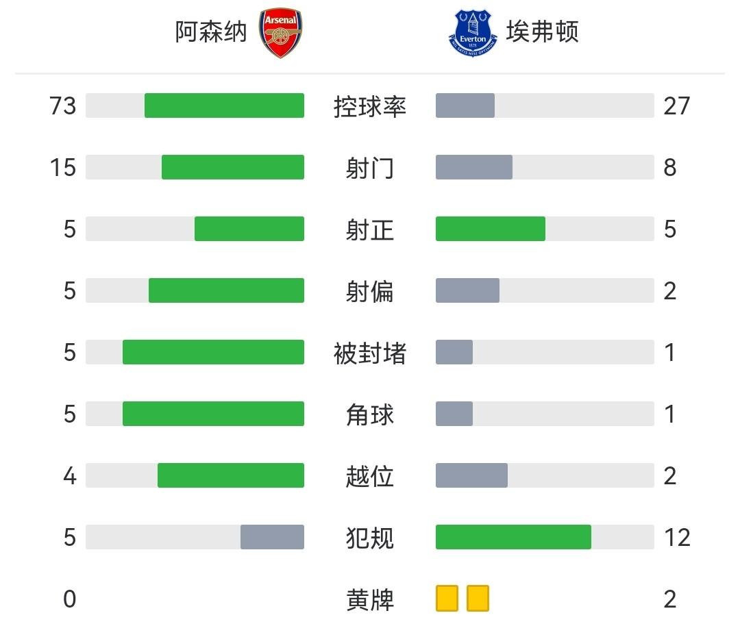 最终阿森纳4-0击败埃弗顿,5分优势领跑积分榜。