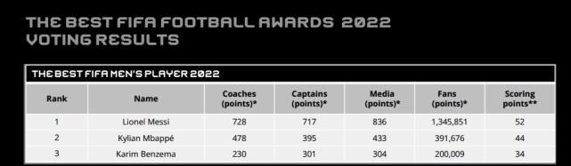 国家队教练投票方面,梅西728分第1位,姆巴佩478分第2位,本泽马230分第3位。国家队队长投票,梅西717分第1位,姆巴佩395分第2位,本泽马301分第3位。记者投票方面,梅西836分,姆巴佩433分,本泽马304分。网络投票梅西更是取得断崖式领先,票数为1345851票,姆巴佩则只有391676票。本泽马则为200009票。