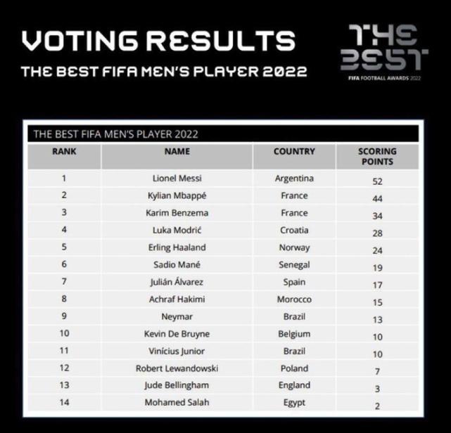 值得注意的是,在国际足联公布的具体得分情况中,梅西得到了52分,而第2名的姆巴佩则是44分。梅西只赢了姆巴佩8分,看起来梅西这次获得年度最佳球员过程似乎很惊险。