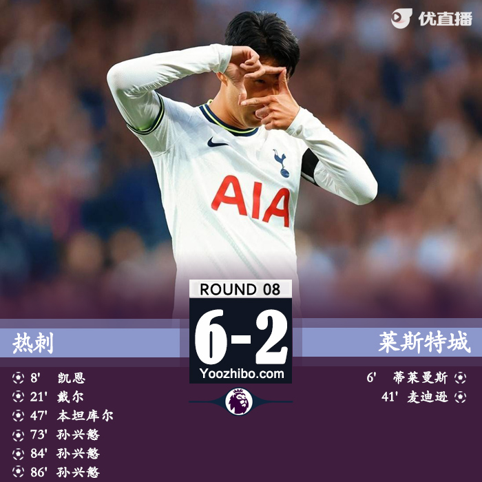 全场比赛结束,热刺主场6-2大胜莱斯特城。