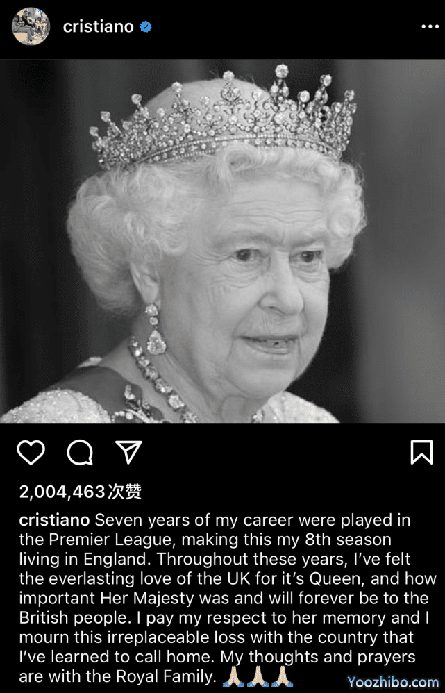C罗晒出了一张英国女王的黑白照,并且附文深情写道:“我的职业生涯中有7年是在英超度过的,这是我在英格兰生活的第8个赛季。在这些年里,我感受到了英国对女王永恒的爱,以及女王陛下对英国人民的重要性,无论是在过去或者是将来。我尊重对她的记忆,我对这个我已经习惯称之为家的国家无可弥补的损失,表示哀悼。我的心与英国王室同在。”