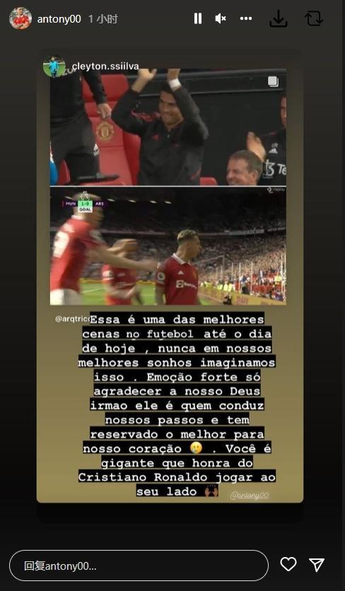 安东尼破门后,C罗起立为他鼓掌,安东尼转发了这张照片:“这是足坛最美的画面之一,在C罗身边踢球是一种荣幸!”