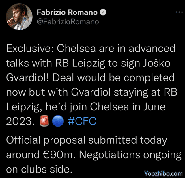 24直播网08月31日讯 凌晨,来自意大利天空体育著名记者Fabrizio Romano的独家报道,切尔西正在就克罗地亚国脚中卫格瓦迪奥尔的交易,和莱比锡红牛队进行深入谈判。