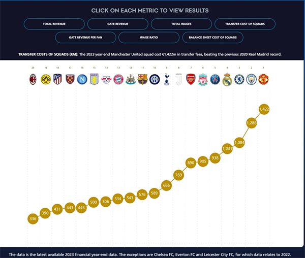 24直播网02月15日讯 据欧洲足球协会的研究报告称,曼联花费14.2亿欧全欧洲最高,并且也是有史以来最昂贵的。曼联阵容中包括8200万英镑的安东尼、8000万英镑的马奎尔、7300万英镑的桑乔和7000万英镑的卡塞米罗。但是这个数据还不包括7200万英镑的霍伊伦、5500万英镑的芒特以及4700万英镑的奥纳纳等人,他们都是在2023年夏季转会窗口加入球队(计入下个财年)。