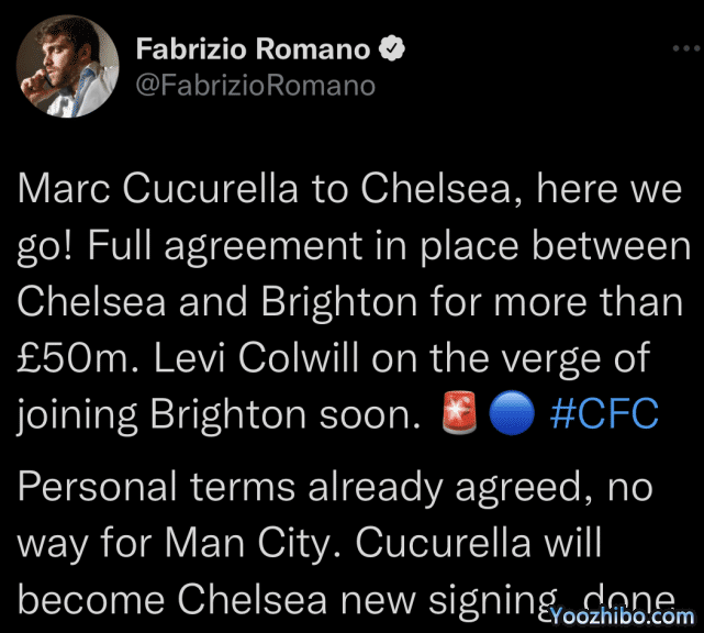 24直播网08月04日讯 ,来自知名转会专家罗马诺的最新消息,英超豪门切尔西俱乐部就西班牙左后卫库库雷利亚的转会,和布莱顿俱乐部达成协议,蓝军也与球员谈妥合同,后者将在周四抵达伦敦接受体检。双方将签约至6年,至2028年。