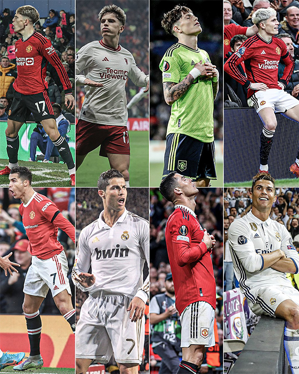 而且,加纳乔不只一次模仿了C罗的庆祝动作,葡萄牙巨星几乎所有的模式,曼联「新C罗」都学过了一遍。上周,阿根廷天使迪马利亚曾警告加纳乔,最好别再学习C罗。这位也曾在皇马与C罗做过队友的球星解释道:「如果我是加纳乔,我不会模仿克里斯蒂亚诺(罗纳尔多),如果我进球,我将学习梅西。」