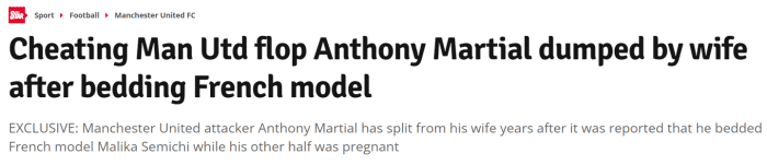 对马夏尔而言,离婚堪称双重打击,最近他在球场上诸事不顺,被塞维利亚的球迷嘘了一顿。他在西班牙期间只进了一球,今夏肯定将被遣送回曼联。