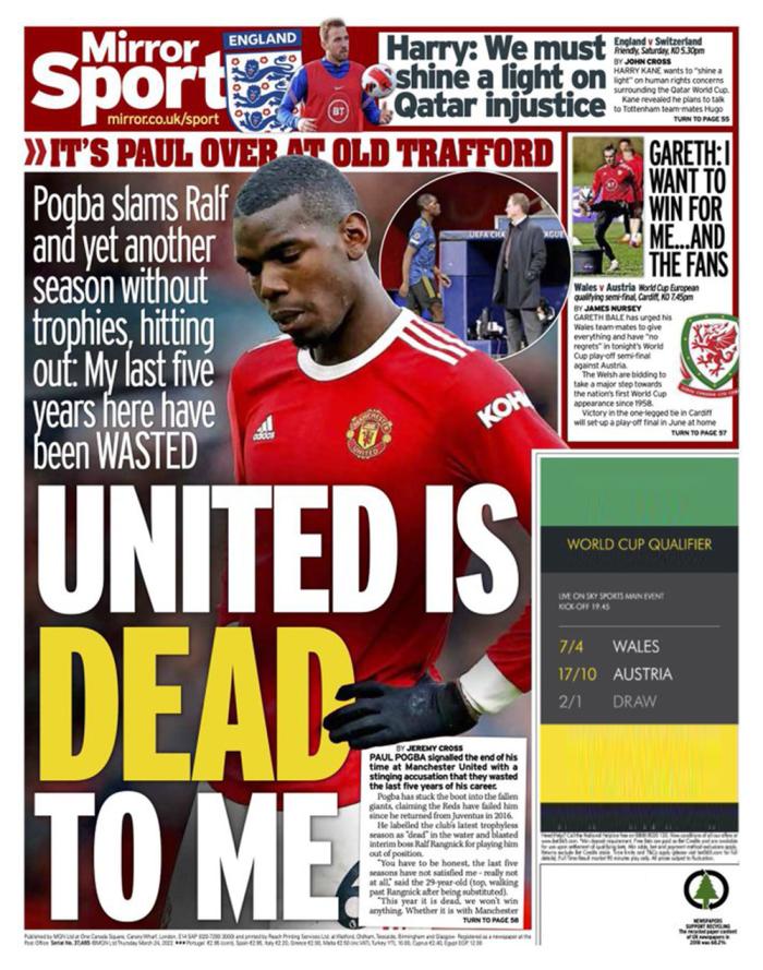 博格巴再次强调自己在曼联的5年过得失意,本赛季已经相当于「死了」,让他觉得悲哀。博格巴说:「这个赛季还没结束,但几乎完蛋了,因为我们已经不可能夺得任何冠军。我希望夺冠,为了远大目标而比赛,但今年乃至过去几年,我们都无缘冠军,这真是令人悲伤。为法国队踢球,就像一股新鲜空气,那是事实。在曼联经历很多困难的时刻,我需要这样的休息,来恢复精力和信心。有时,当我(在曼联)打不上比赛,或者成绩不佳,来到法国队可以让人振奋,呼吸一口新鲜空气,这也有助于我更好地回到俱乐部。」