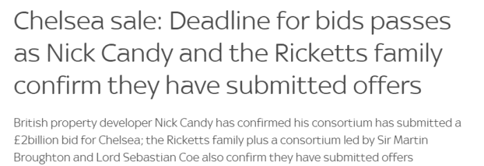 24直播网03月19日讯 天空体育消息,切尔西出售事宜的报价截止日已过,英国地产大亨尼克-坎迪确认报价20亿英镑。