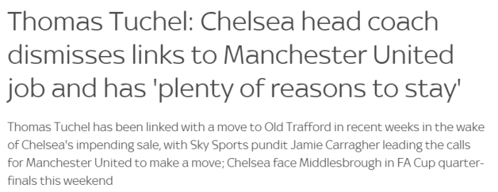 阿布被迫出售俱乐部后,有报道称曼联想邀请图赫尔执教。不过他在周末的足总杯比赛前表示:“事实上我没有对传言做出任何回应。你们认为我在俱乐部没那么专一了吗?肯定不是的。”