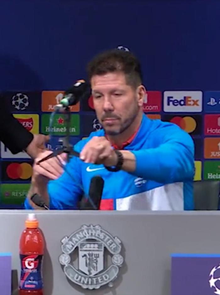 西蒙尼坐下后,测试了音响设备一切正常,随后顺手把有曼联官方电视台MUTV的麦克风拿起,放到了一边。曼联的摄影师表示了不满,马竞主帅回应道:「比赛中也会发生不可预测的事情!」