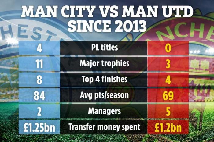 后弗爵时代,曼城赢得4次英超冠军,本赛季可能第5次夺冠,而曼联的最佳战绩是两次联赛亚军。自2013/14赛季以来,两队的赛季平均积分说明了一切,曼城为84分,而曼联仅有69分。