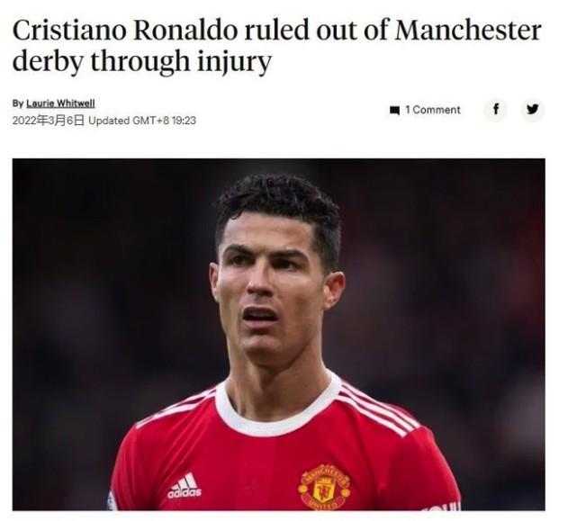 曼联遭重击!C罗因伤无缘曼市德比,卡瓦尼同样缺席!2人或客串中锋