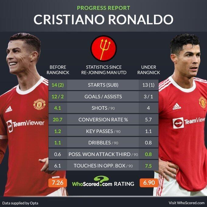 而在朗尼克上任后,C罗场均射门4次,场均禁区内触球7.5次,14场比赛只打进3球,送出1个助攻,射门转换率降至5.7%。