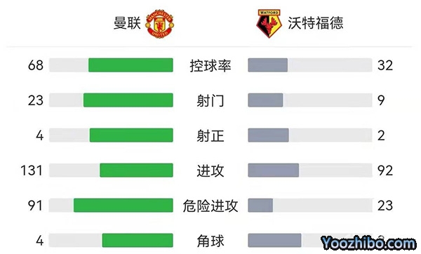全场比赛结束,曼联0-0沃特福德。