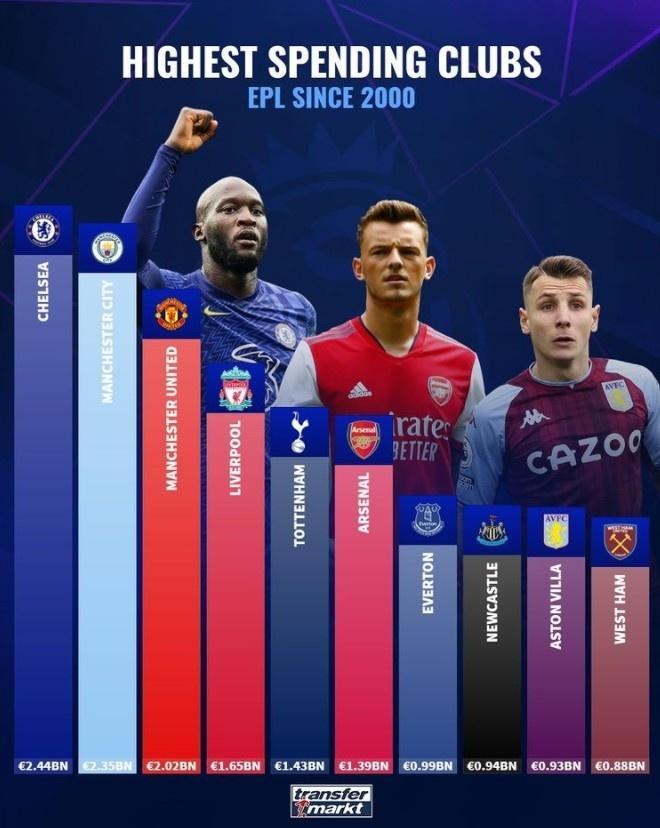 21世纪英超各队引援投入排行:切尔西24亿居首