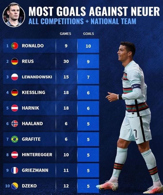 俱乐部+国家队各项赛事攻破诺伊尔球门榜: