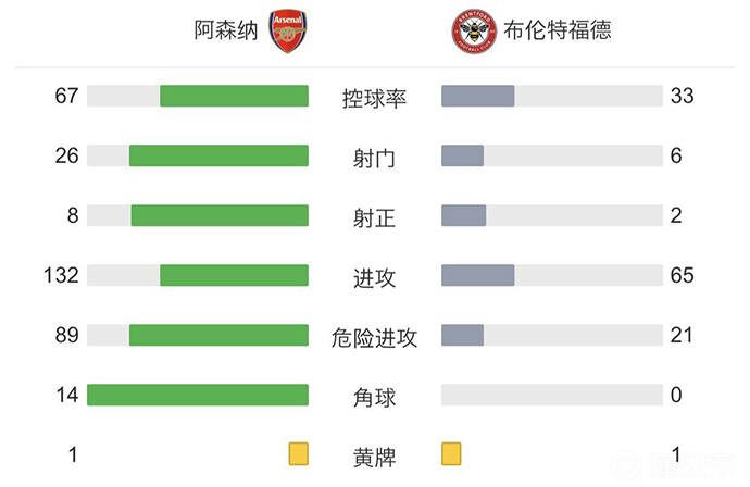 全场比赛结束,阿森纳2-1布伦特福德。