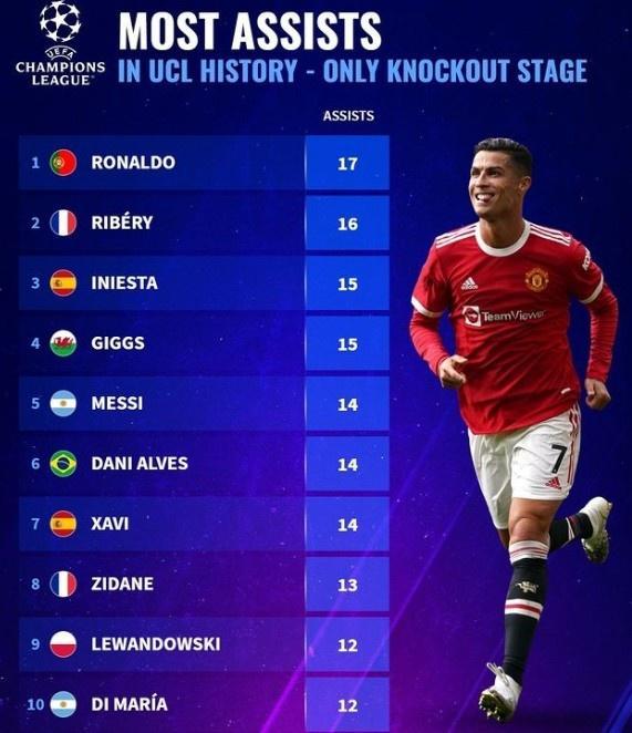24直播网02月18日讯 德国转会市场今日统计了欧冠联赛淘汰赛历史助攻榜,C罗17次助攻排名第一。