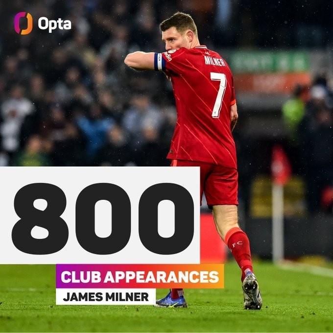 今天凌晨,利物浦在欧冠1/8决赛客场2-0击败国米,米尔纳在下半场最后阶段替补登场,这是他职业生涯第800次在俱乐部层面出场比赛。