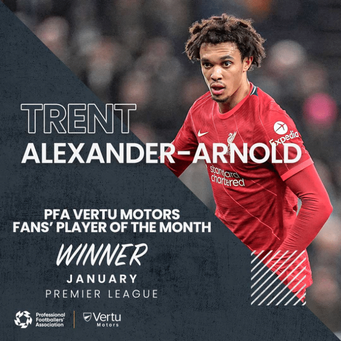 官方:阿诺德当选PFA球迷票选英超1月最佳球员