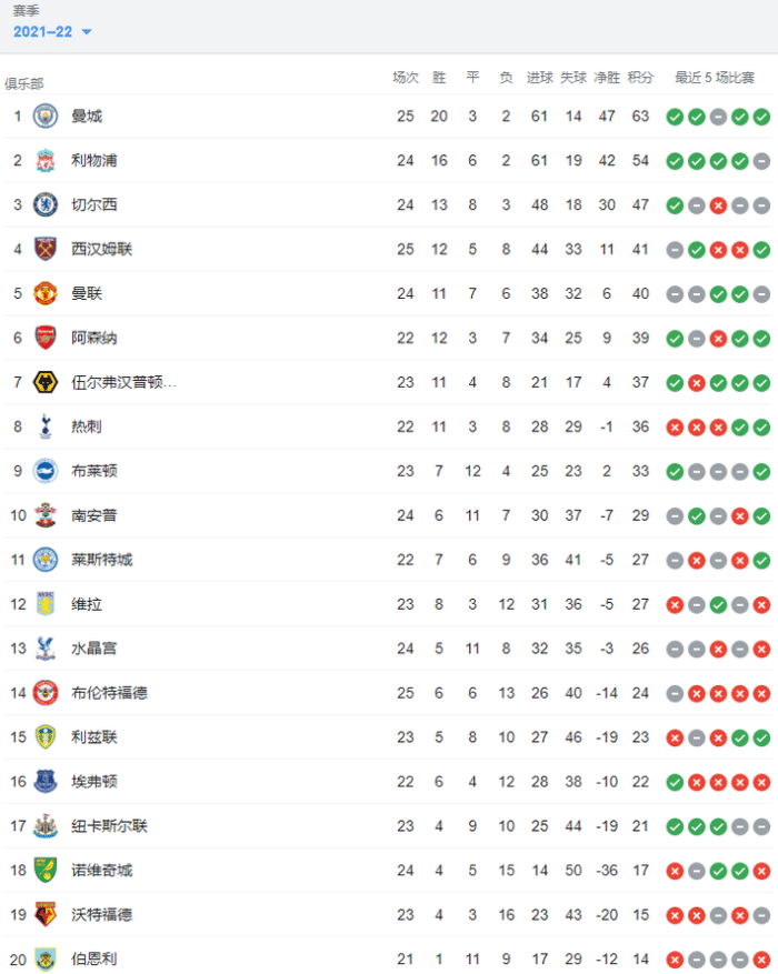曼城25轮63分仍居第一,利物浦24轮54分排在第二,切尔西24轮47分排名第三,西汉姆25轮41分排名第四。