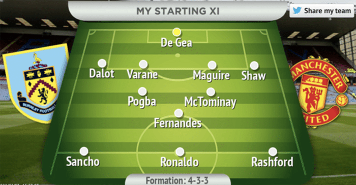 英国《曼彻斯特晚报》预测曼联对伯恩利首发:德赫亚/迪奥古·达洛,瓦拉内,马奎尔,卢克·肖/博格巴,麦克托米内,布鲁诺·费尔南德斯/桑乔,C罗,拉什福德。