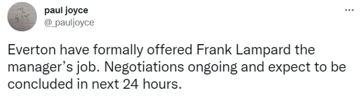 该记者表示,埃弗顿已经正式邀请兰帕德出任球队主帅,双方正在进行谈判,预计24小时之内就会官宣。