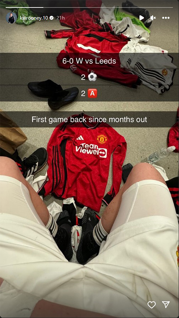 在曼联青训营中,还有一名球员年仅14岁,却备受关注,因为他是传奇前锋韦恩·鲁尼的长子!凯伊·鲁尼最近时隔数月后伤愈复出,在第一场比赛就代表14岁以下青年队梅开二度,并有两次助攻,帮助球队6-0大比分击败了死敌利兹联。小鲁尼的社媒已经拥有17.4万粉丝,他也在2022年被知名运动品牌彪马签下,拥有了个人赞助合同。