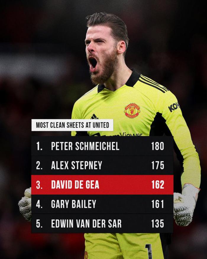 现在,德赫亚只差18场不失球,就可以追平彼得·舒梅切尔保持的180场的俱乐部历史纪录,但他还得首先超越另一位曼联著名守门员,阿历克斯·斯特普尼以175场零封排名第二,领先德赫亚13场。