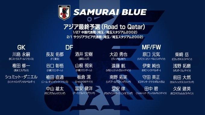 中前场:大迫勇也(神户胜利船),远藤航(斯图加特),南野拓实(利物浦),堂安律(埃因霍温),原口元气(柏林联合),伊东纯也(亨克),守田英正(圣克拉拉),田中碧(杜塞尔多夫),柴崎岳(莱加内斯),浅野拓磨(波鸿),前田大然(凯尔特人),久保建英(马洛卡)