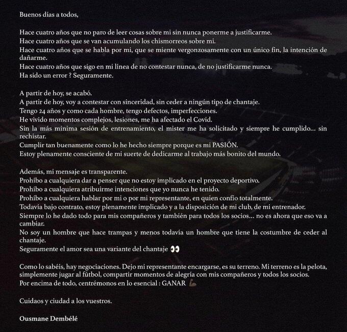 24直播网01月21日讯 登贝莱今天就自己的续约问题发表了一份声明,他表示自己四年多来一直遭受污蔑,但从未辩解,并称现在谈判正在进行中,他会继续专注于球场上的工作。
