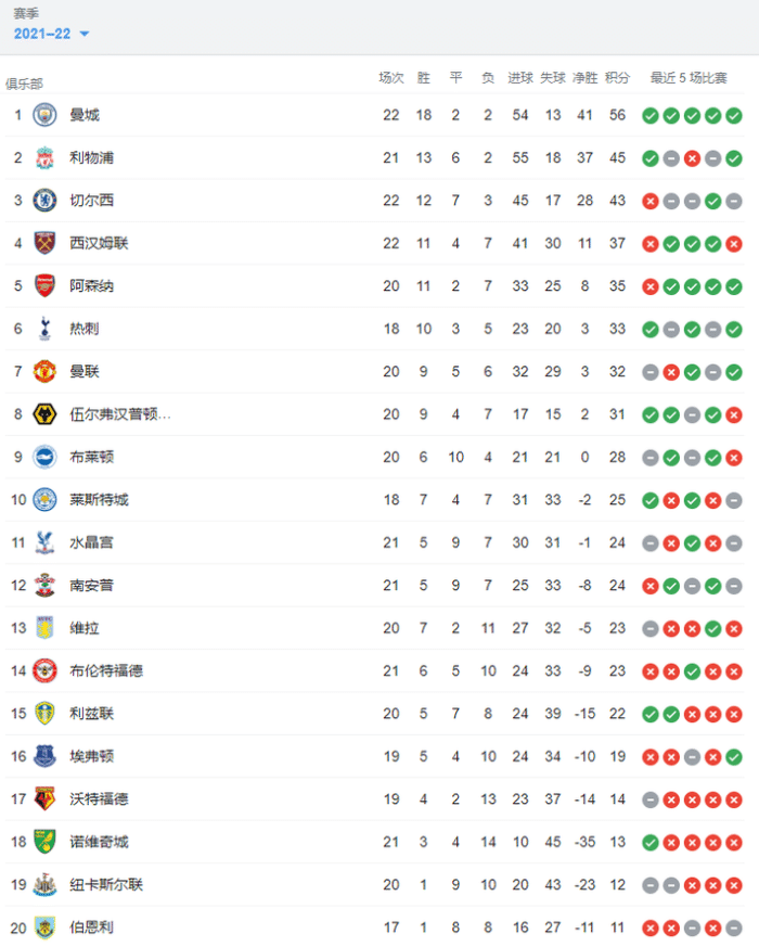 曼城22轮56分一骑绝尘,领先第二名少赛一轮的利物浦多达11分。切尔西22轮43分排名第三,西汉姆22轮37分排名第四。
